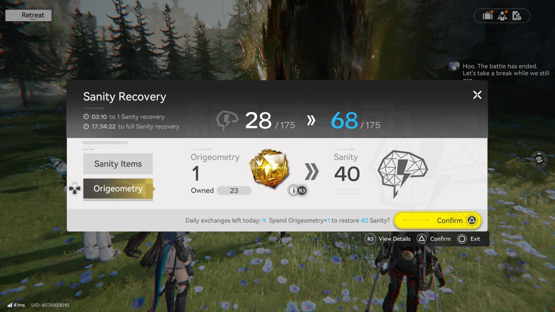 Origeometry — ценный ресурс, поэтому используйте его только тогда, когда он вам действительно необходим. Помните, вы также можете восстановить Sanity и получить Oroberyl другими способами. Например, вы можете использовать предметы, такие как Emergency Sanity Boosters, чтобы восстановить Sanity, и зарабатывать Oroberyl, просто играя в игру.