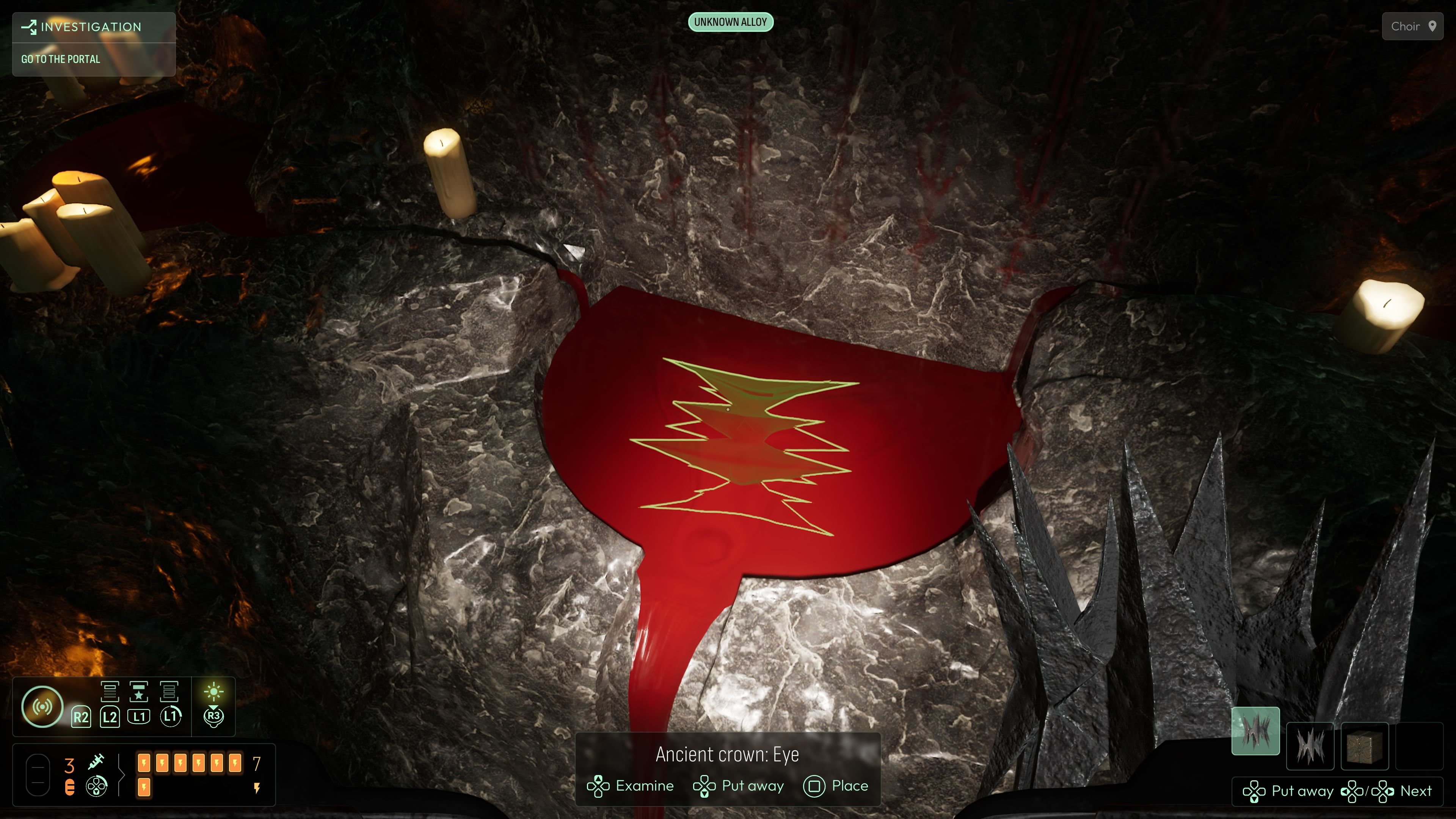 К счастью, две из трех корон легко найти, потому что они обе находятся в стартовой области. Первая находится прямо за главным алтарем на полу, а вторая — на столе в лагере, где мы обнаружили батарею. Последнюю корону, спрятанную в проходе слева, мы найдем чуть позже.