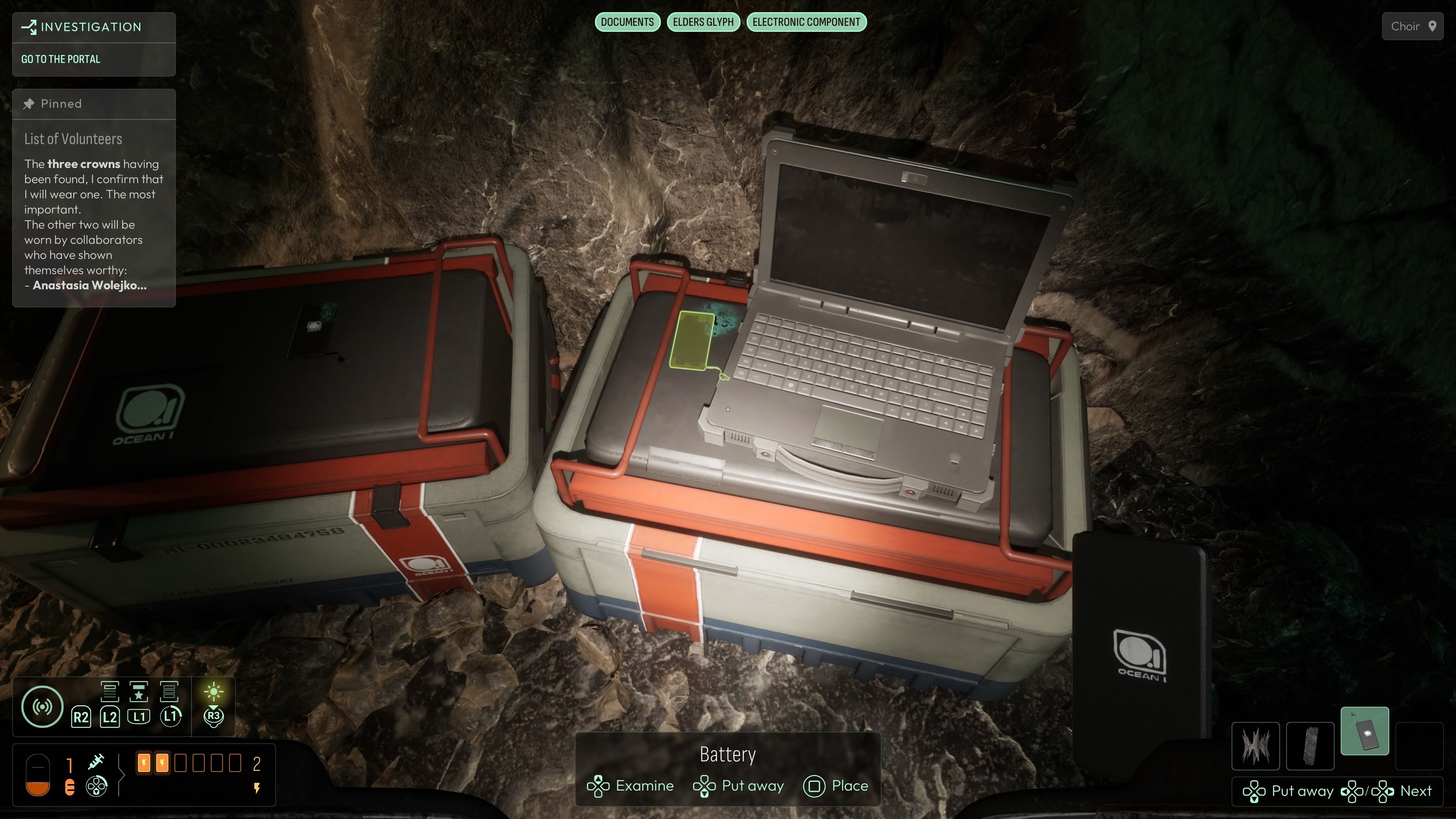 Обойдите алтарь сзади, и вы обнаружите небольшой лагерь Ocean-I с несколькими ящиками. Проверьте ящик слева – вы найдете больше батарей, но при ближайшем рассмотрении становится ясно, что они заполнены литием, а не гелием. Это говорит о том, что с оборудованием в этом районе что-то не так.