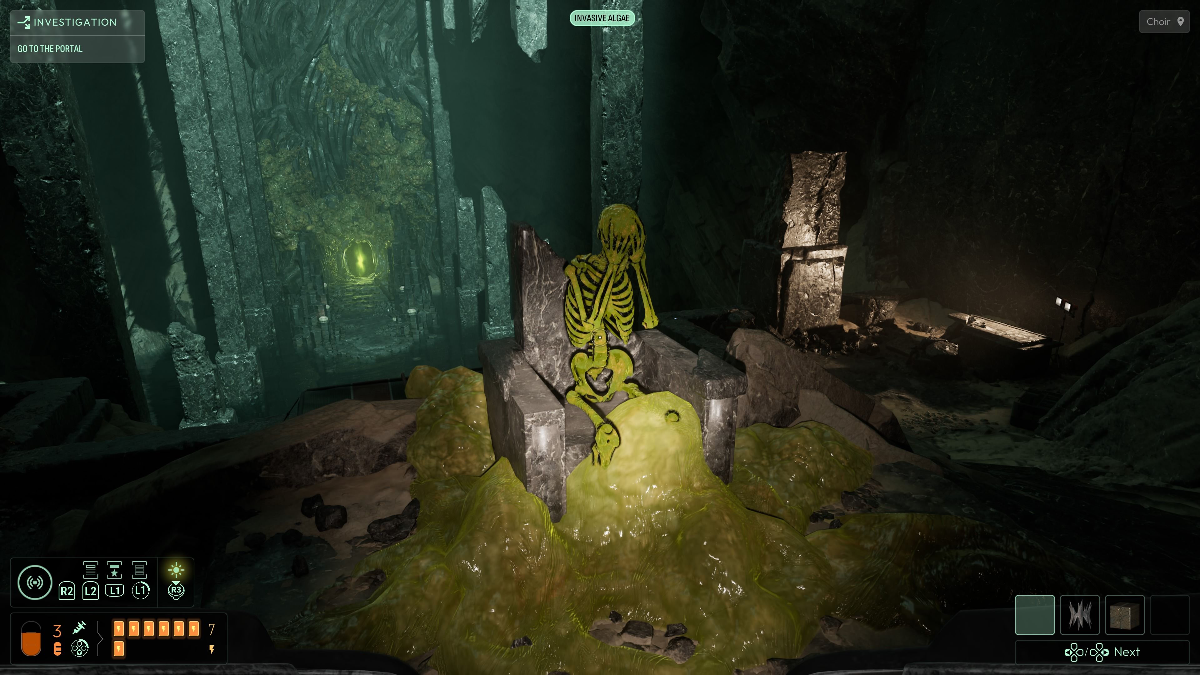 После того, как вы переведете текст, вам нужно завершить ритуал, начатый командой Ocean-I, прежде чем они сошли с ума. Этот ритуал состоит из трех частей: найти три старые короны, совершить благословение над ними, а затем надеть их на головы скелетов, сидящих на тронах.