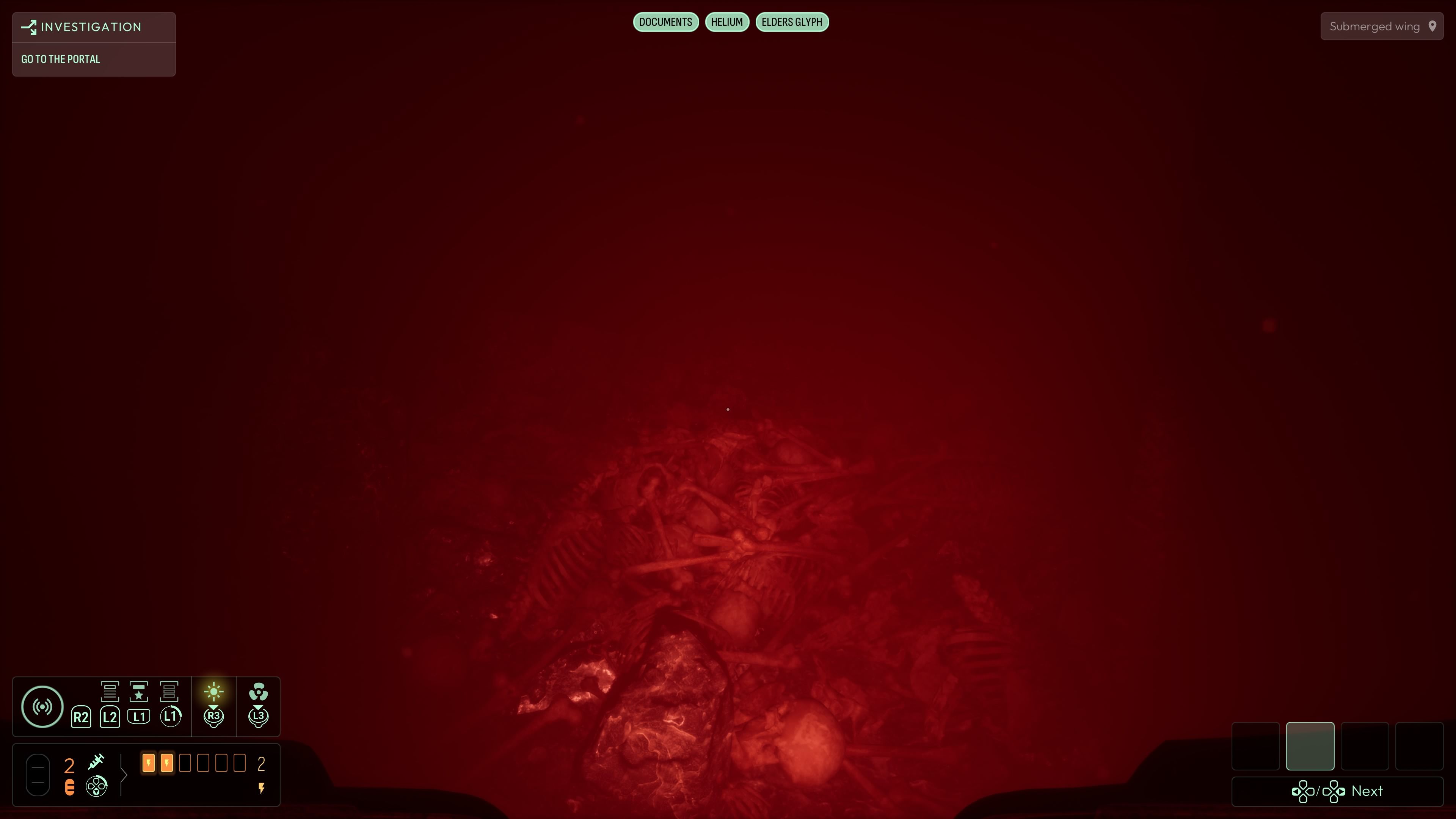 Покиньте эту область и вернитесь к бассейну с кровью. Найдите подводную лестницу, которая приведет вас к другому скелету, сидящему на троне. Этот скелет нуждается в древней короне, которую вы нашли ранее, но не забудьте благословить его сначала! Для этого подойдите к выходу, который находится прямо перед троном. Вы найдете запертую дверь, для открытия которой нужен круглый предмет – и, к счастью, он лежит на полу неподалеку, рядом с трупом и аудиожурналом.