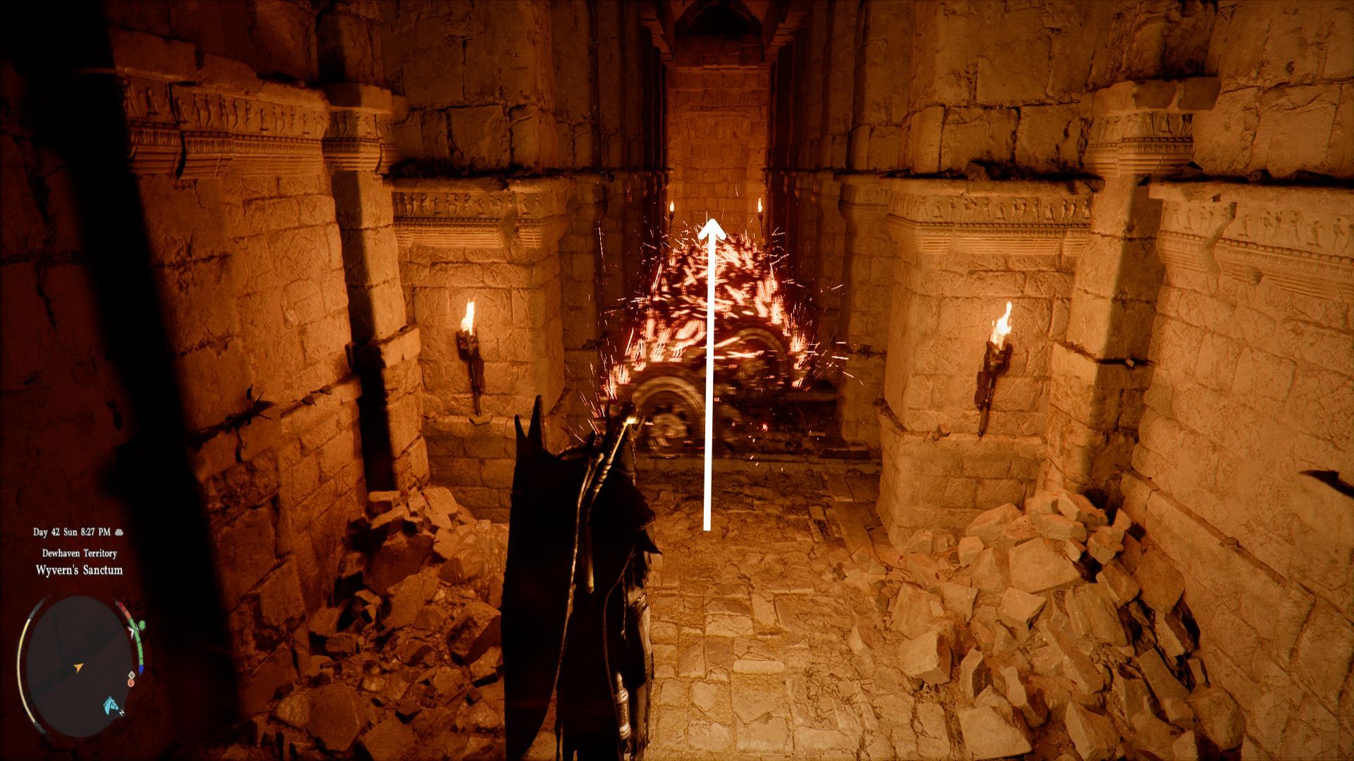 Окей, значит, я спустился по лестнице, и поначалу показалось, что это тупик. Но потом я заметил два факела, по одному с каждой стороны комнаты – игра даже указала на них стрелками, что было полезно. Я зажег оба факела, и бум, открылась запечатанная дверь! Это была довольно крутая маленькая головоломка.