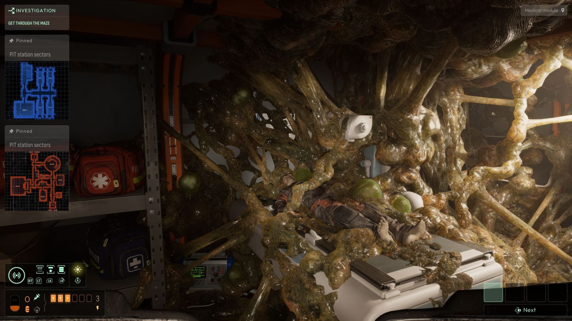 Помимо этого, в игре присутствует несколько важных систем. У Ноя есть полоска энергии, которая поддерживает его здоровье и скорость, и она восстанавливается довольно отвратным, но забавным способом – путем инъекции инопланетного гриба! Также есть механика ‘Corruption’, которая, похоже, влияет на рассудок Ноя и то, как он воспринимает мир. Я еще не видел всех эффектов этого, так как поиграл только в начало игры, но кажется, что это искажает его чувства.