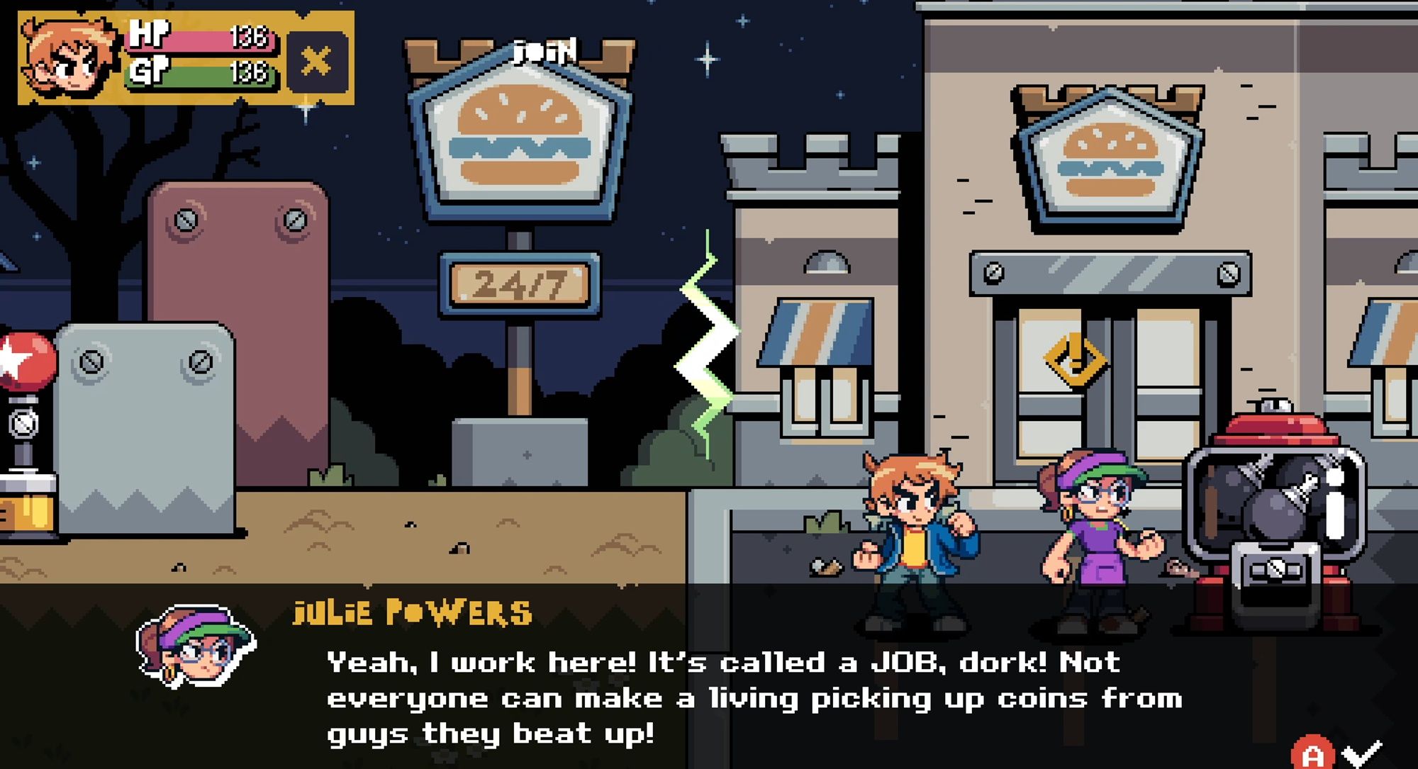 Игра полна забавных, неожиданных моментов, которые разрушают четвёртую стену. Вы можете увидеть, как персонажи вроде Юнга Нейла забывают свои реплики, или Уоллес признаётся, что жульничал, подглядывая в руководство по игре, чтобы быстро добраться до конца. Есть даже прямые отсылки к другим историям о Скотте Пилигриме. И если вы не смеётесь над цитатами, взятыми прямо из фильма – например, «Он выбил ей блики из волос!» – или не видите, как ругательства Джули цензурируются, возможно, вы просто робот!