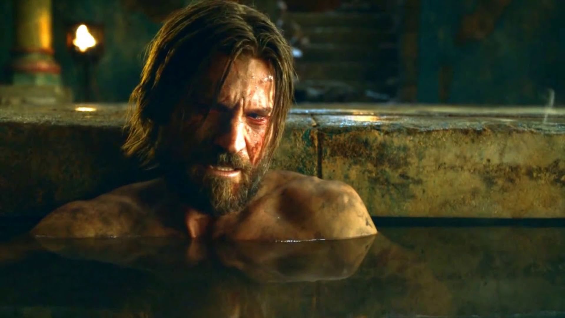 В мощной пятиминутной сцене Джейме Ланнистер раскрывает свою внутреннюю сущность, принимая ванну с Бриенной. Мерцающий свет свечей на воде визуально представляет его уязвимость после потери руки. Он открыто признается в своих отношениях с Серсеей и впервые объясняет, почему он убил Безумного Короля Эйриса II Таргариена. Он признается, что действовал, чтобы спасти своего отца, Тайвина, после того как Безумный Король приказал ему убить его.