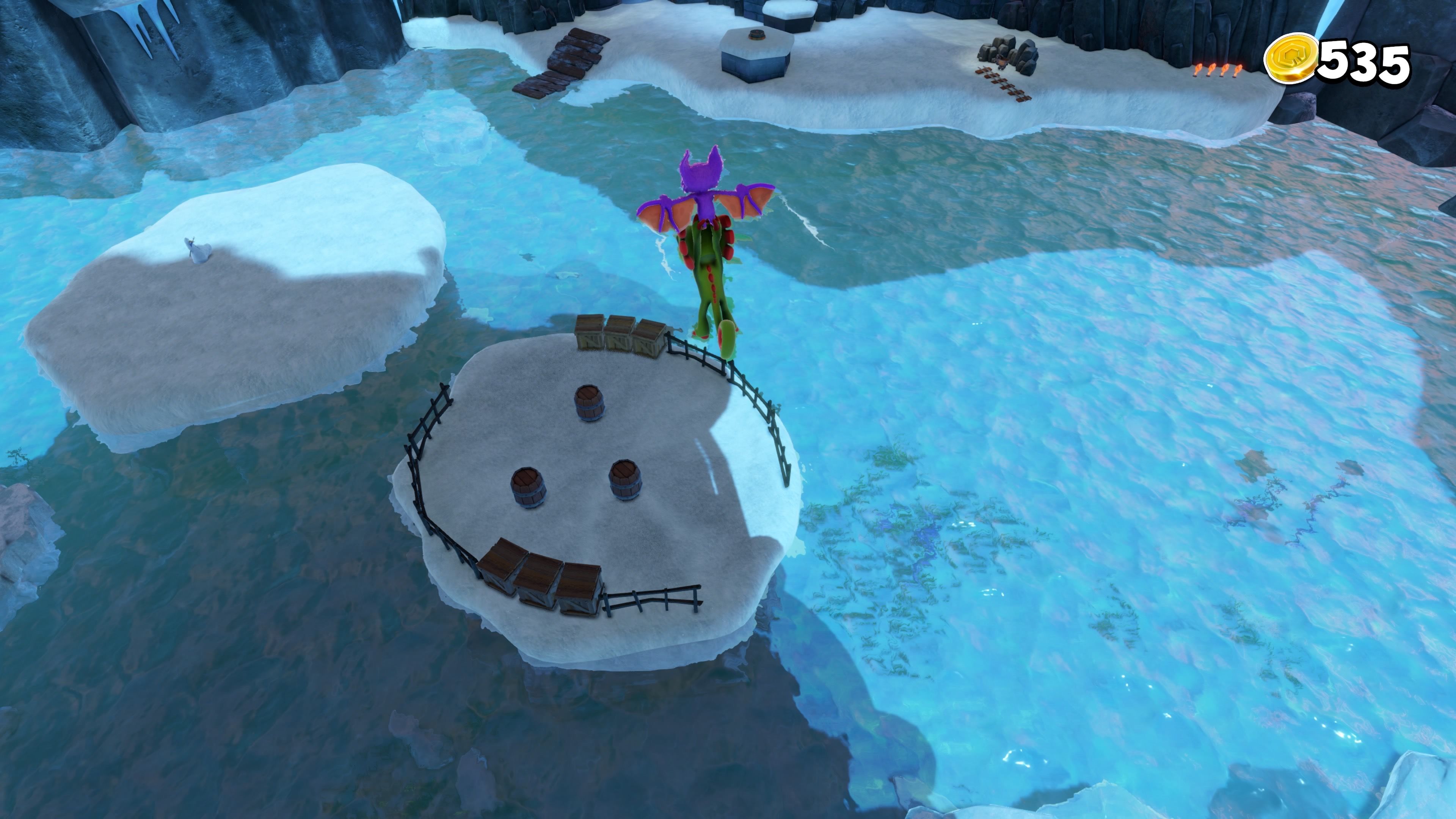 - На этом уровне также разбросаны несколько облачных ящиков, позволяющих вам летать, один из которых находится прямо у входа во дворец Icymetric. Втяните в себя энергию, а затем слетите вниз на этот выступ.
