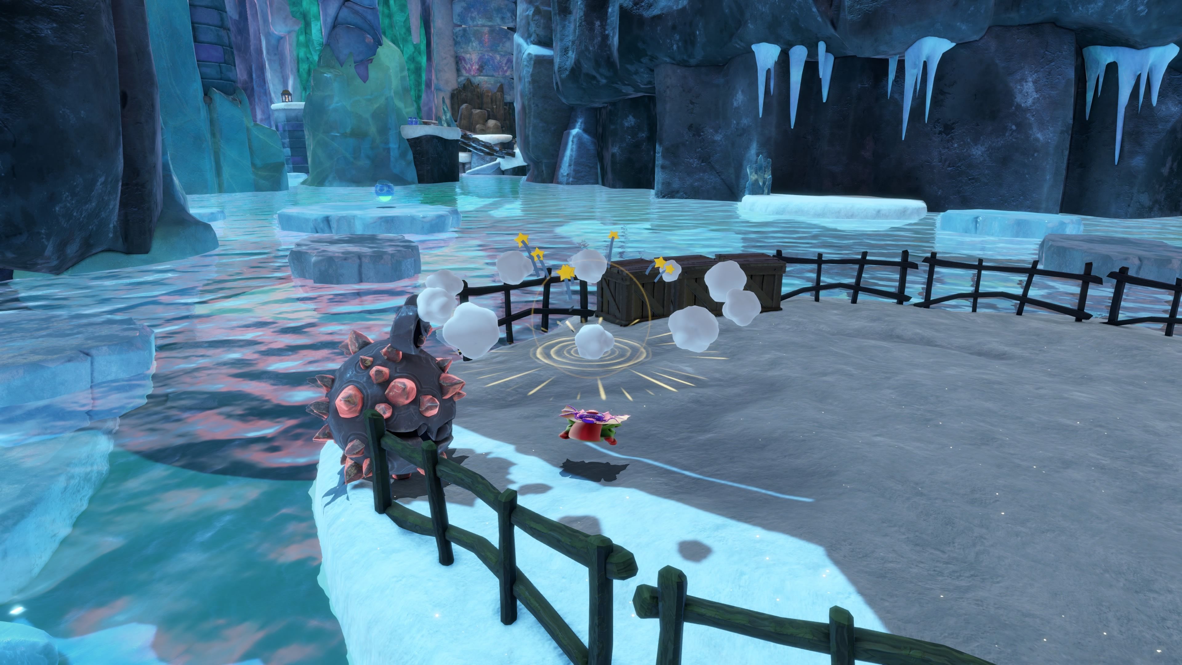 Вы попадете на ледовую площадку, усыпанную деревянными ящиками. Как только вы войдете, на вас нападет волна врагов. Победите их всех, используя базовые вращающиеся атаки, пока не исчезнут все враги.